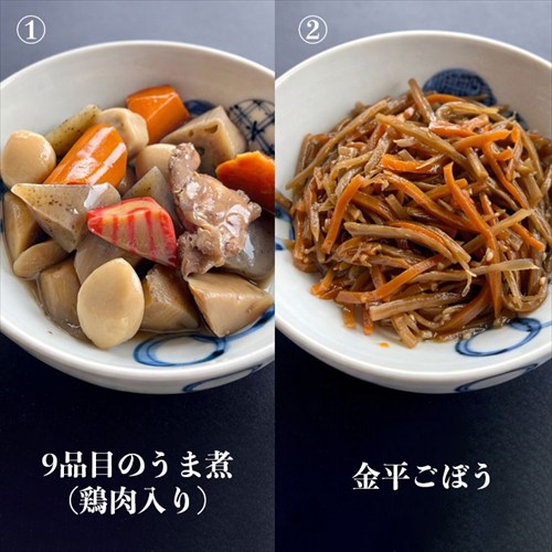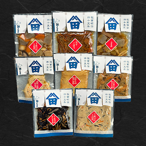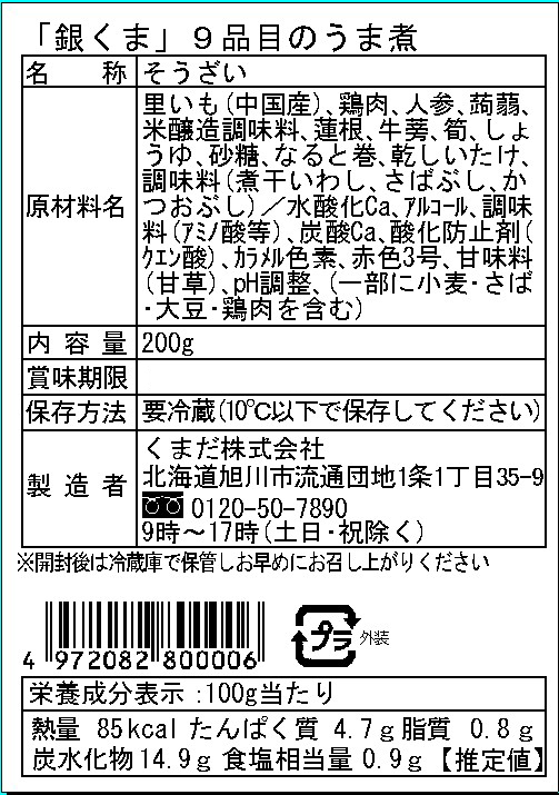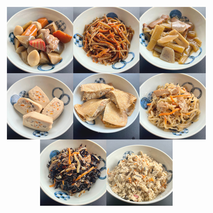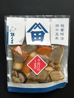 里いも、にんじん、ごぼう、筍、れんこん、なると、しいたけ、鶏肉、こんにゃくを丸大豆しょうゆをベースに優しい味付けに仕上げました。